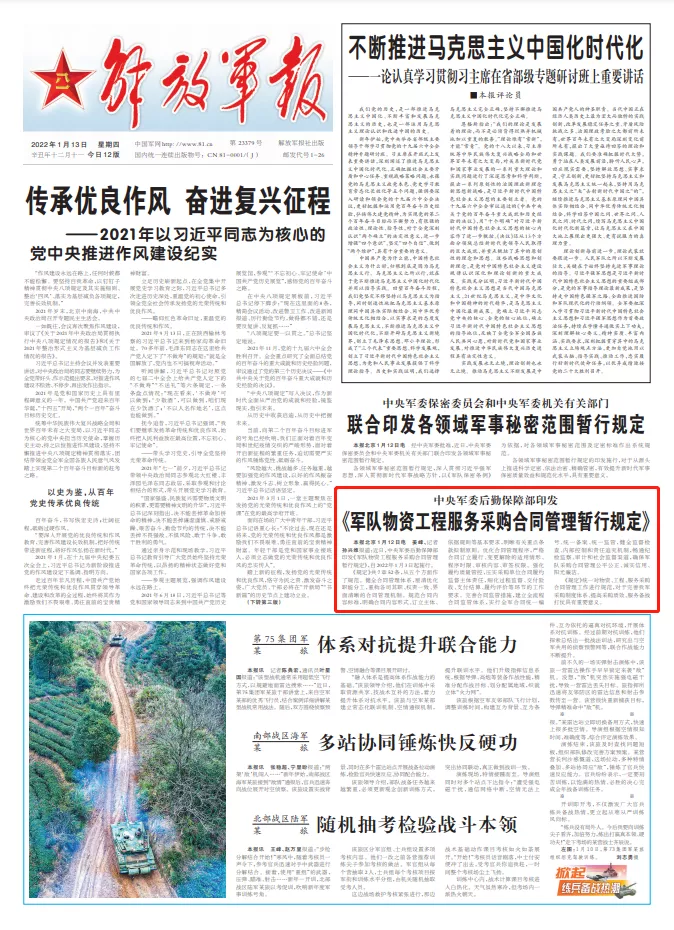 近日,中央军委后勤保障部印发《军队物资工程服务采购合同管理暂行规定》,自2022年1月3日起施行。