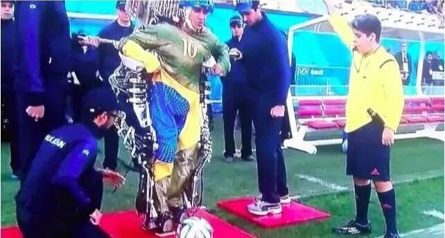 2012年巴西世界杯——机器战甲,身着机器战甲的截肢残疾者,凭借脑机接口和机械外骨骼开出了一球。